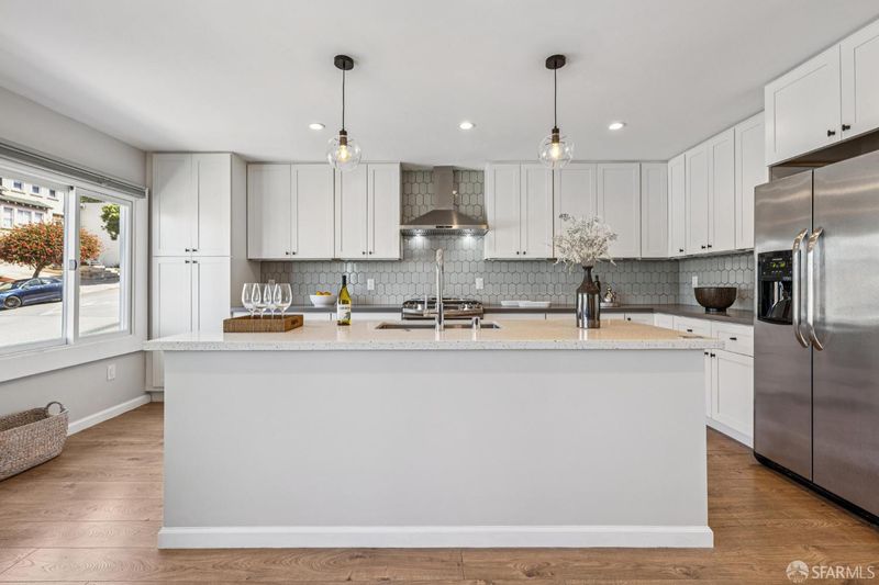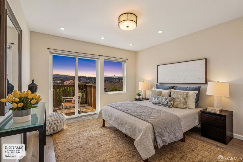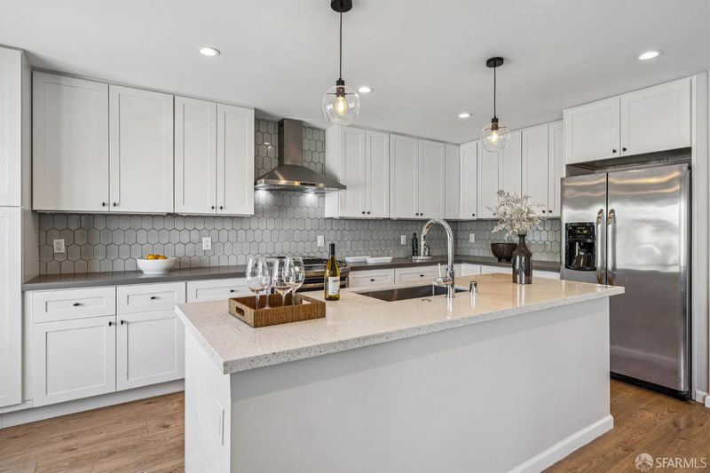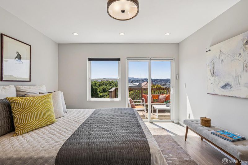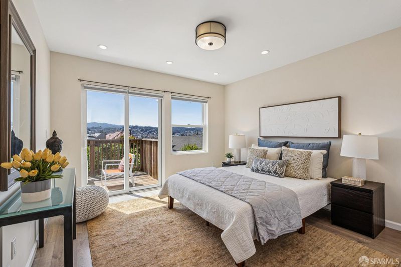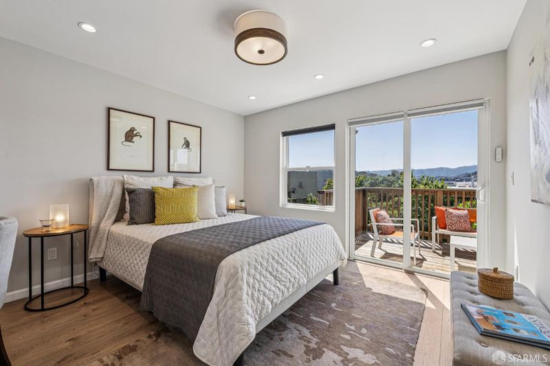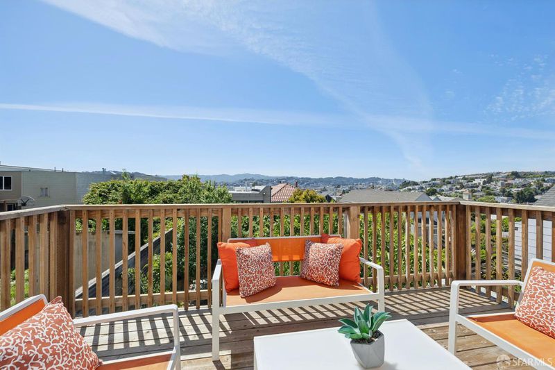 Views from the front and views from the back! This expansive 5-bedroom, 3-bathroom mid-century home delivers the best of Bayview living from every angle. Perched on one of the neighborhood's most desirable blocks, the home has been thoughtfully remodeled to blend modern comfort with timeless design.Take in sweeping city views from the living room, with glimpses of both Bay Bridge and Golden Gate Bridge towers, or enjoy your morning coffee from the second-story rear deck overlooking the Bayview valley and San Bruno Mountains beyond The main level features a bright, open-concept floor plan ideal for entertaining, anchored by a massive chef's kitchen with stainless steel appliances, stone countertops, tile backsplash, and abundant cabinetry. A large center island with sink and bar seating seamlessly connects the kitchen to the living and dining areas, all bathed in natural lightcreating a true heart-of-the-home experience.Three spacious bedrooms are located on the main level, including two with direct access to a sunny south-facing view deck. Downstairs, you'll find two additional bedrooms, including a generous primary suite with dual vanities and a stone shower. A separate kitchenette with sink and wine fridge, along with its own private entrance, offers excellent potential for guest quarters or income opportunities. Both lower-level bedrooms open directly to the backyard and deck, enhancing the home's indoor-outdoor flow.The semi-private, landscaped yard is a true retreat, featuring mature, producing fig and pluot trees, all-day sun, and views toward Twin Peaks. Additional highlights of the home include a one-car garage, ample storage throughout, dual-pane windows throughout, updated flooring, bathroom skylight, security video system, high-end lighting fixtures, fresh exterior paint, partial custom closets, and a breezeway entrance connecting both levels.Located on a quiet block walking distance from the 3rd Street corridor and Muni T-Line, you're close to local favorites like Gratta Wines, All Good Pizza, Tato, Cafe Alma, and Old Skool Cafe, with easy access to both 280 and 101 freeways. One block from Hilltop Park, one of SF's most exciting new parks and skateparks.Experience the very best of Bayview living.