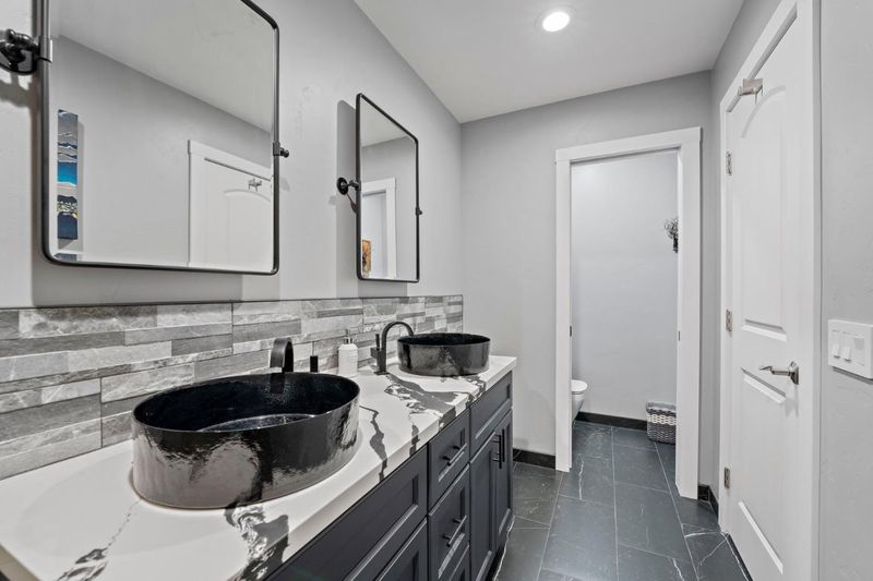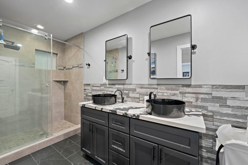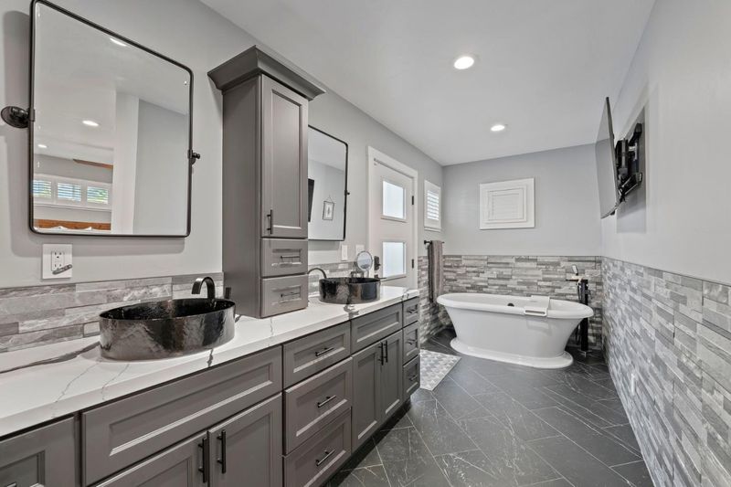- Double Sinks, Full on Ground Floor, Primary - Oversized Tub, Primary - Stall Shower(s), Solid Surface, Tile, Updated Bath