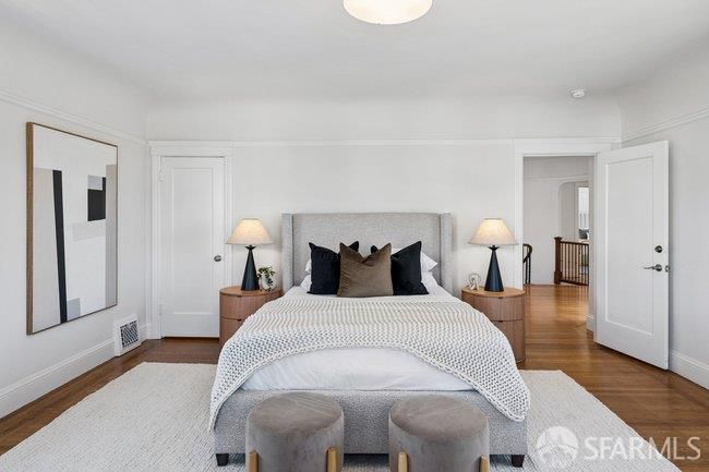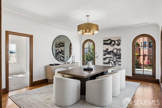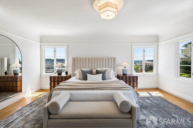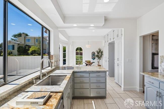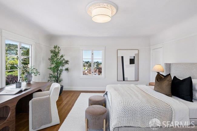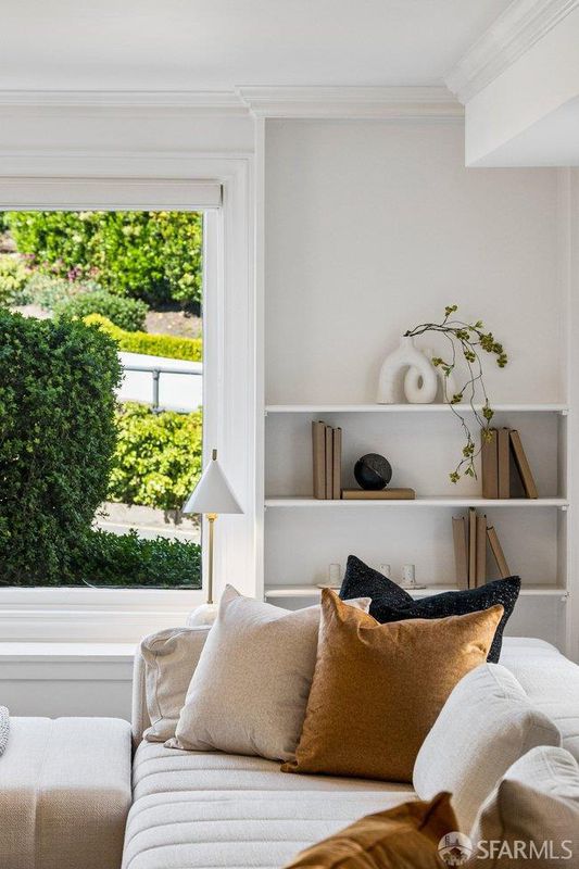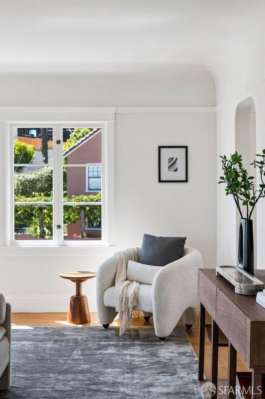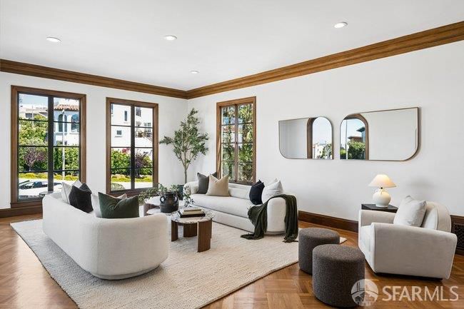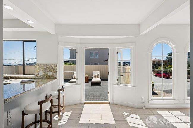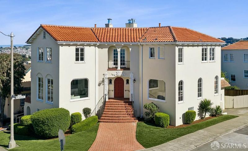 At the crest of Monterey Boulevard, where the city opens to sweeping southwestern horizons, 1185 Monterey Boulevard presents a poised balance of classic architecture and quiet modern refinement. Set behind an elegant facade, the home unfolds with an understated confidence; rooms of generous proportion, softened by natural light that moves easily from morning to late afternoon. Period details, subtle moldings, warm wood tones, and carefully preserved finishes anchor the interiors, while thoughtful updates lend a sense of present-day livability. The main level is anchored by the sunken living room, stretching over 27 feet in length with large windows on three sides, a view to the ocean, and a large fireplace. The elegant dining room is perfect for entertaining, easily accommodating a table for ten. The eat-in kitchen features a dedicated breakfast area, extensive counters and cabinetry and a walkout to the sun-drenched patio. On this level is the fifth bedroom and a full bath. Up the curved staircase is a large landing and balcony with ocean views. Four of the bedrooms and two baths are on this floor, including a primary suite with dressing area and en-suite bath. Bedrooms are well-scaled with 360 degree outlooks that frame neighborhood greenery, ocean and bay views. The garden level features additional space that the owners used as a family room. The large four car garage can be accessed through two different staircases and offers plentiful room for cars and storage. Light-filled south facing backyard provides a quiet counterpoint to the city beyond, with space for gardening, dining, or play. Close to stores and restaurants of West Portal and Stonestown, including Whole Foods, Sports Basement and Elena's.