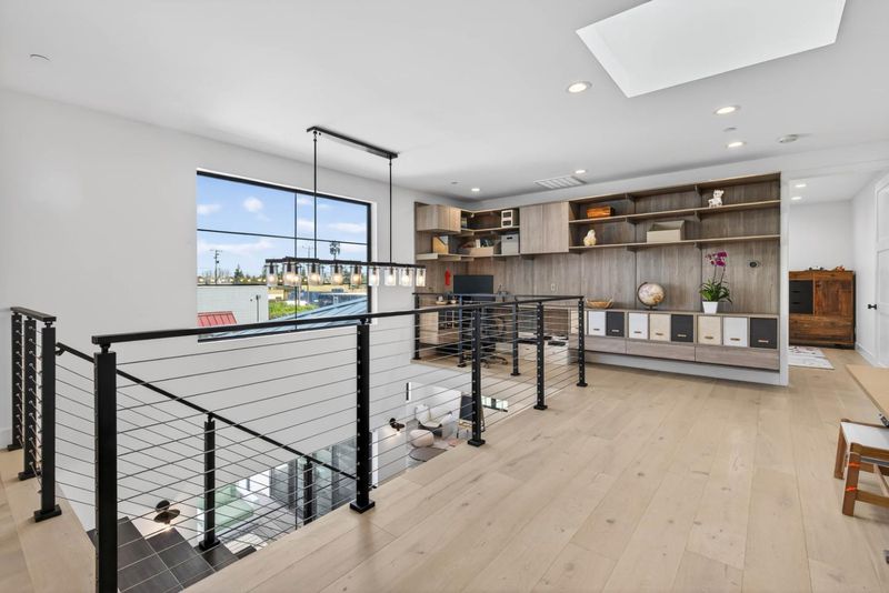 Newer 2024 built contemporary home in the highly sought-after Monta Vista neighborhood, near Apples Infinite Loop & Spaceship Campus, major tech hubs, & Hwys 85 & 280. Top-rated schools include Lincoln Elem., Kennedy Mid., & Monta Vista High. Featuring a bright open-concept layout with high tray ceilings, recessed lighting, skylights, & large-format tile flooring. Flow connects the family room, dining area, kitchen, & outdoor living spaces. The family room showcases a linear fireplace & feature wall. The kitchen has a large center island, two-tone cabinetry, stainless steel appliances: built-in refrigerator & wall ovens, cooktop, hood, butlers pantry, & designer fixtures. A dedicated bonus room & spacious upstairs loft with built-in workstation, floor-to-ceiling storage, wet bar, & beverage fridge. The primary suite features a private balcony, spa-inspired bath with freestanding soaking tub, dual floating vanity, slab-style tile walls, frameless glass shower with niches, designer sconces, & water closet. Designer-appointed bathrooms throughout, dedicated laundry room, & custom mudroom. Exterior features a covered patio with skylights, additional open patio, expansive paver areas, & a private fully fenced backyard with lawn, hardscape, & low-maintenance landscaping.