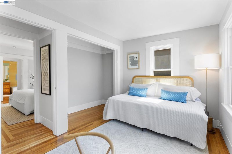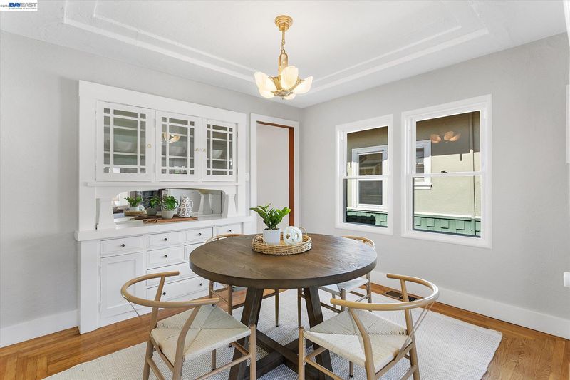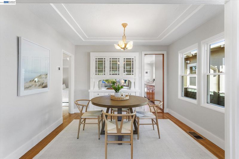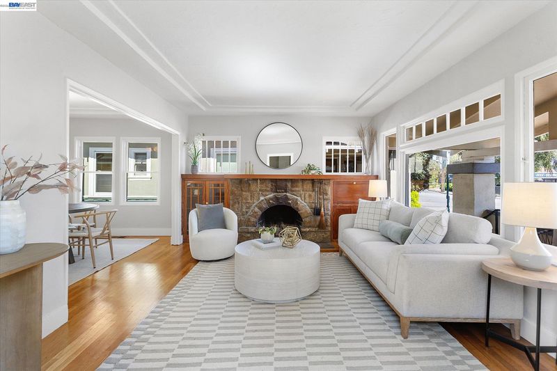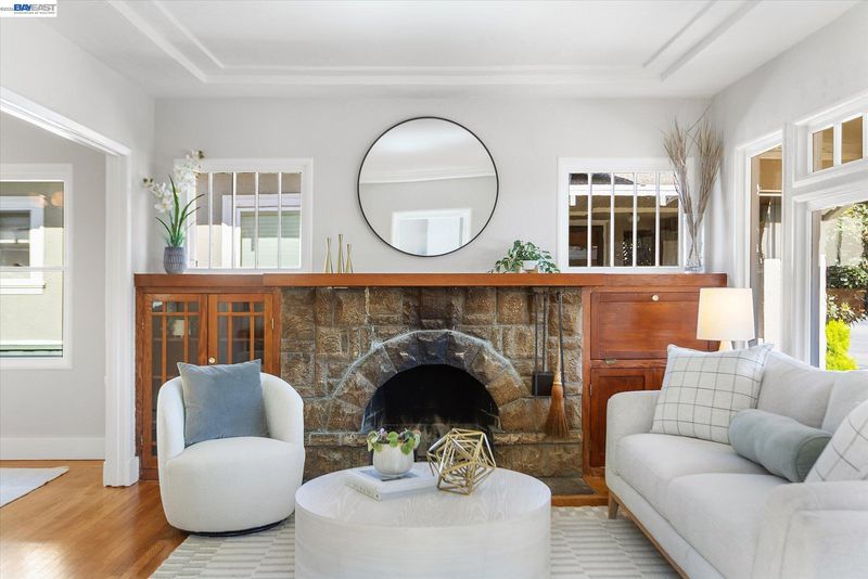 Charming Craftsman bungalow on Alameda’s coveted East End, featuring a spacious and inviting front porch that encourages you to slow down and stay awhile. This 2-bedroom, 1-bath home offers 891 square feet of thoughtfully updated living space, blending timeless character with modern comfort.Refinished hardwood floors, fresh interior paint, and classic built-ins surrounding the fireplace highlight the home’s original charm. The dining room showcases beautiful original cabinetry and an Art Deco chandelier, adding warmth and character.The light-filled kitchen is bright and functional, especially for a home of this era, with a well-designed layout, brand-new dishwasher and microwave hood, and direct access to the backyard through French doors for seamless indoor-outdoor living. Modern upgrades include air conditioning, an upgraded furnace, and a tankless water heater.The sunny second bedroom features a full wall of windows overlooking the backyard, while the spacious primary bedroom includes a walk-in closet. A vintage tiled bathroom and stackable washer and dryer add both charm and convenience. Outside, enjoy a south-facing backyard with a private deck, mature fig tree, and generous space for entertaining or gardening, along with a storage shed. This home offers the best of Alameda!
